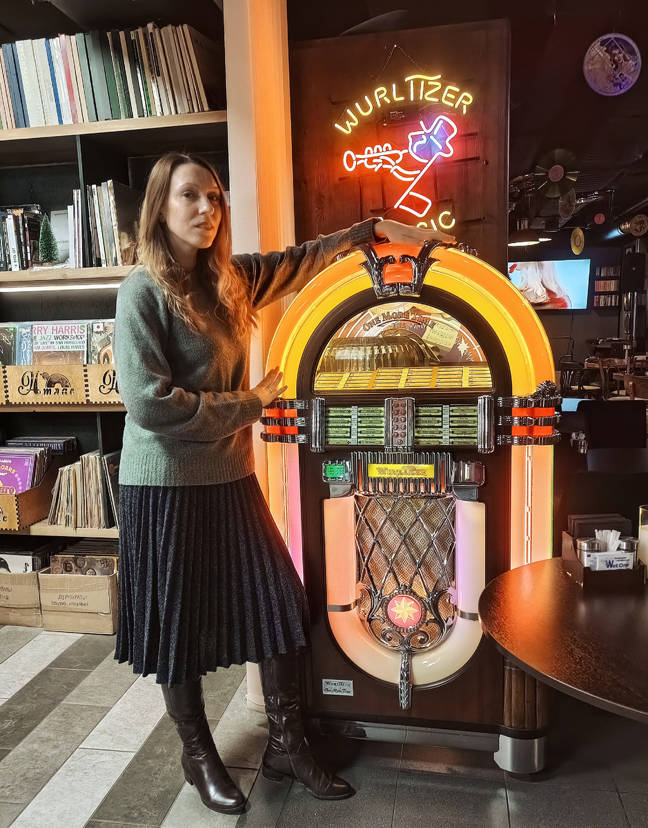 На первом этаже находится стилизованное ретро-кафе и магазин виниловых пластинок, а внизу расположился концертный зал и музей. Коллекция частная, собрана с душой, здесь есть очень редкие экспонаты, например, самая большая в мире пластинка и самая маленькая, самый маленький граммофон, один из самых старых работающих джук-боксов 1936 года, аппаратура из студии, где записывались Битлз и многое другое.