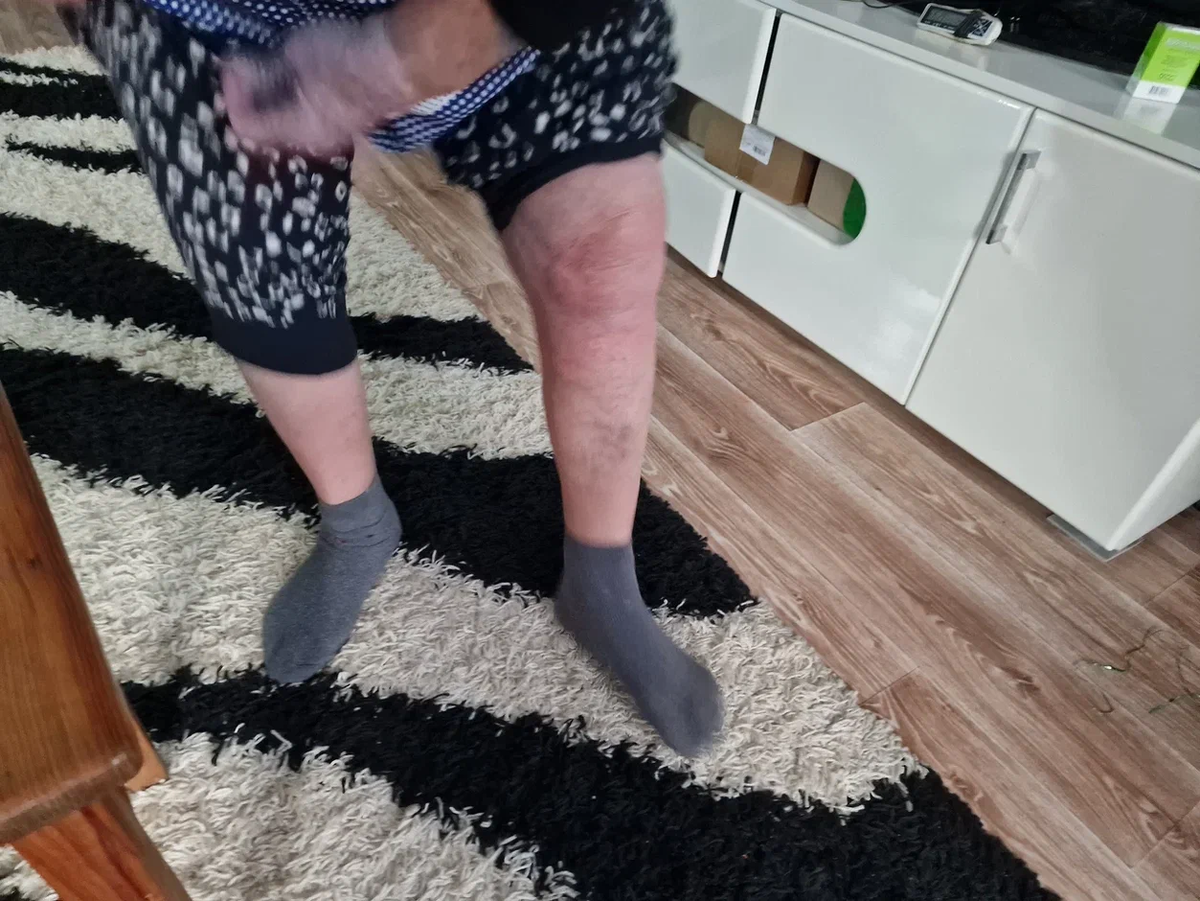 Людмила Николаевна по моей просьбе показала своё колено, оно уже который год мучает её, выглядит жутко, конечно. Раздуло.