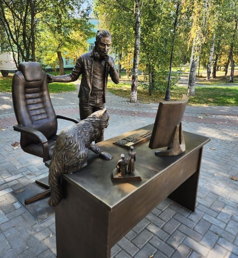 А вот совсем новый памятник, вернее, скульптурная композиция, она появилась в Ижевске на бульваре Гоголя 19 сентября этого года: Здесь показан собирательный образ программиста, стоящего у своего рабочего стола. На нем монитор, клавиатура, кружка, обязательный атрибут рабочего стола айтишника, скульптура ижевских оружейников, а ещё на столе сидит кот, он играет с компьютерной мышью. На мониторе визитки с логотипами местных компаний, проспонсироваших эту жанровую скульптуру. Ее авторами стали члены союза художников России Александр Чувашев и Андрей Галимзянов, а также член союза дизайнеров страны Алексей Ильин. Это первый в России памятник компьютерщику. Такая история сегодня . Ваши "Прогулки"
