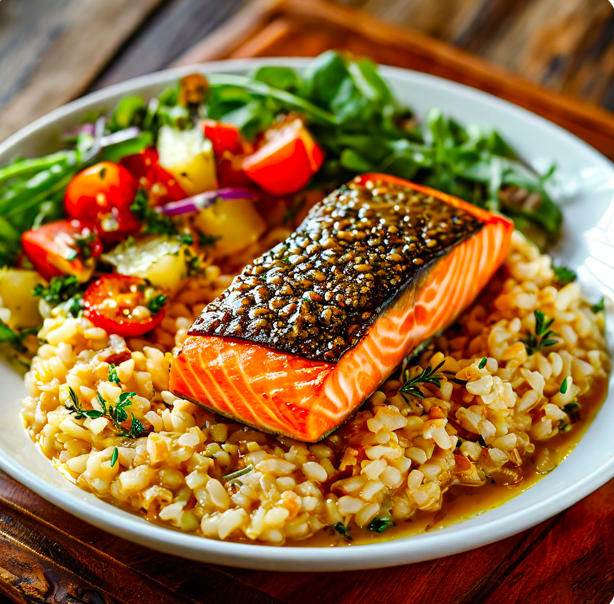 Когда приходит вечер, и вся семья собирается у стола, хочется удивить своих близких чем-то вкусным, но в то же время несложным в приготовлении. Сегодня я поделюсь с вами рецептом филе лосося в медово-горчичном соусе, который идеально дополняется кремовым ризотто и свежим овощным салатом. Эта комбинация подарит вам насыщенный букет вкусов и станет звездой вашего ужина. Для филе лосося: - 4 куска филе лосося - 2 ст. ложки меда - 2 ст. ложки дижонской горчицы - 1 ст. ложка соевого соуса - Сок половины лимона - Соль и свежемолотый черный перец по вкусу - Оливковое масло для жарки Для ризотто: - 200 г риса арборио - 1 л куриного бульона - 1 маленькая луковица, мелко нарезанная - 2 зубчика чеснока, измельченные - 100 мл белого сухого вина - 50 г тертого пармезана - 2 ст. ложки сливочного масла - Соль и перец по вкусу Для салата: - Смесь свежих листьев салата (руккола, шпинат, латук) - 1 огурец, нарезанный полукружиями - 1 сладкий перец, нарезанный полосками - 100 г черри-помидоров, разрезанн