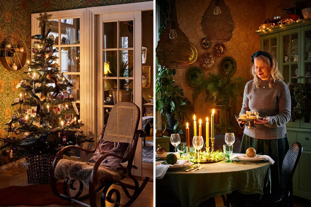 По деревянному дому с мансардой разносится аромат глинтвейна и мерцают свечи. В воздухе витает запах корицы и апельсина... Это потому что палочки корицы и цитрусовые ломтики украшают мшистые композиции. В доме зелень находится везде - и в рисунке обоев, и в комнатных растениях, и в мебели, и в текстиле. Рождественское настроение 47-летней Кирси и ее 16-летней дочери Уны вертится вокруг зеленого цвета.