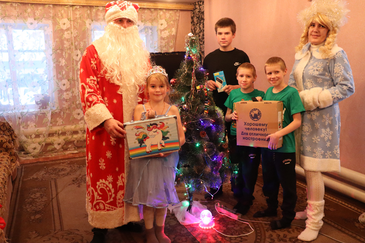 Новогодние гости пожелали Аскару исполнения мечты, а Сонечке здоровья и отправились в поселок Станция Ардатов, который в прошлом году пополнился еще одной многодетной семьей. Там, на Вокзальной улице, поселилась семья Каленчук, переехавшая из Астраханской области. По словам мамы Таисии, в южных краях, где они жили, слишком знойное лето и практически не бывает настоящей зимы с морозами и снегом, так что они с мужем Николаем давно хотели поменять климатические условия. Как-то раз в Москве, где Николай работал вахтовым методом, он познакомился с уроженцем Ардатовского района, который и предложил им переехать в его родной район и даже помог с поиском недорогого дома. Такой доступный вариант Каленчуки нашли на Станции Ардатов, но и на него пришлось взять кредит. Переезжая на новое место жительства, они не забыли своих домашних питомцев - двух котов и собак, и вообще выяснилось, что это очень добрые и любящие животных люди. Как-то Николай, увидев выпавшего из гнезда птенца голубя, который едва дышал, принес его домой. Всей семьей малыша выходили, за год тот вырос во взрослую птицу, но не спешит покинуть гостеприимный дом Каленчуков. Даже когда его выпускают на улицу, тот всегда залетает обратно. Живет он на шифоньере, периодически слетая на пол, где любит гонять котов – Мурзика и Батона. Те уже давно прекратили попытки поохотиться на птицу, когда узнали силу удара его клюва, так что в доме установились тишь да благодать. О своих питомцах младшие Каленчуки – десятилетние братья-близнецы Тимофей и Григорий и их восьмилетняя сестренка Софья могут рассказывать бесконечно. Пятнадцатилетний Кирилл в силу возраста хотя и стесняется показывать свои эмоции, но все равно видно, что мальчишка он добрый. Семья живет небогато, понятно, что дети не избалованы подарками, поэтому было очень приятно наблюдать, с каким восторгом они приняли подарки от Дедушки Мороза. Соня ахнула при виде большого набора для юного художника, Тимофей и Григорий распаковали коробку с тюбингом, о котором мечтали, и сожалели только об одном – что на улице установилась теплая, как в Астрахани, погода, и покатушки придется отложить до прихода настоящей зимы. Кириллу Дедушка вручил зарядное устройство, за которое он, преодолев смущение, спел песенку про елочку. Младшие же рассказали гостям все стихи про Новый год, которые знали, спели самые популярные песни и с удовольствием поиграли со Снегурочкой. Мама Таисия была очень удивлена, что в нашем районе оказывается такое внимание многодетным семьям, и вообще отметила, что «люди у вас очень хорошие, а какие замечательные учителя в школе – никого не выделяют, ко всем относятся одинаково, дети ходят туда с удовольствием».