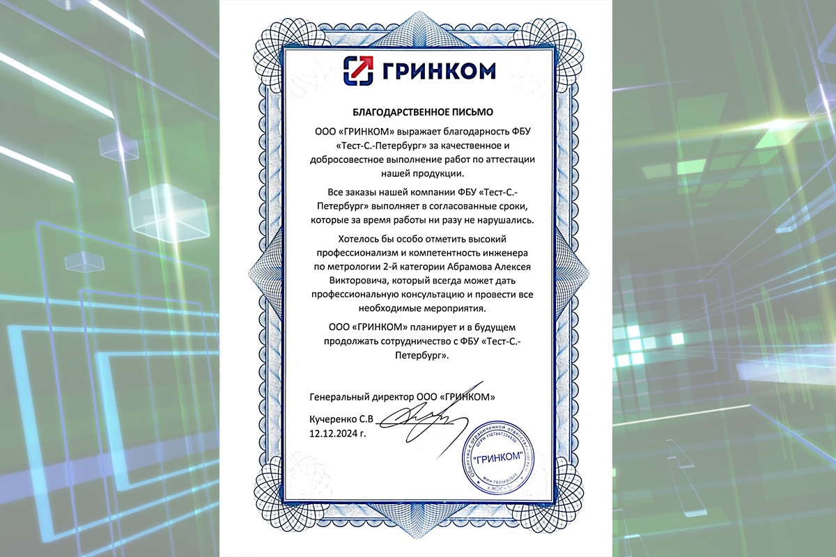 В канун Нового года особенно приятно получать теплые слова благодарности от наших уважаемых заказчиков. ООО «Гринком» в своем благодарственном письме отмечает качественное, добросовестное и всегда своевременное проведение аттестации оборудования работниками ФБУ «Тест-С.-Петербург». При этом особо подчеркивается высокий профессионализм и компетентность инженера по метрологии Алексея Абрамова. Будем рады продолжить сотрудничество и желаем коллективу ООО «Гринком» новых успехов и достижений в 2025-м году!