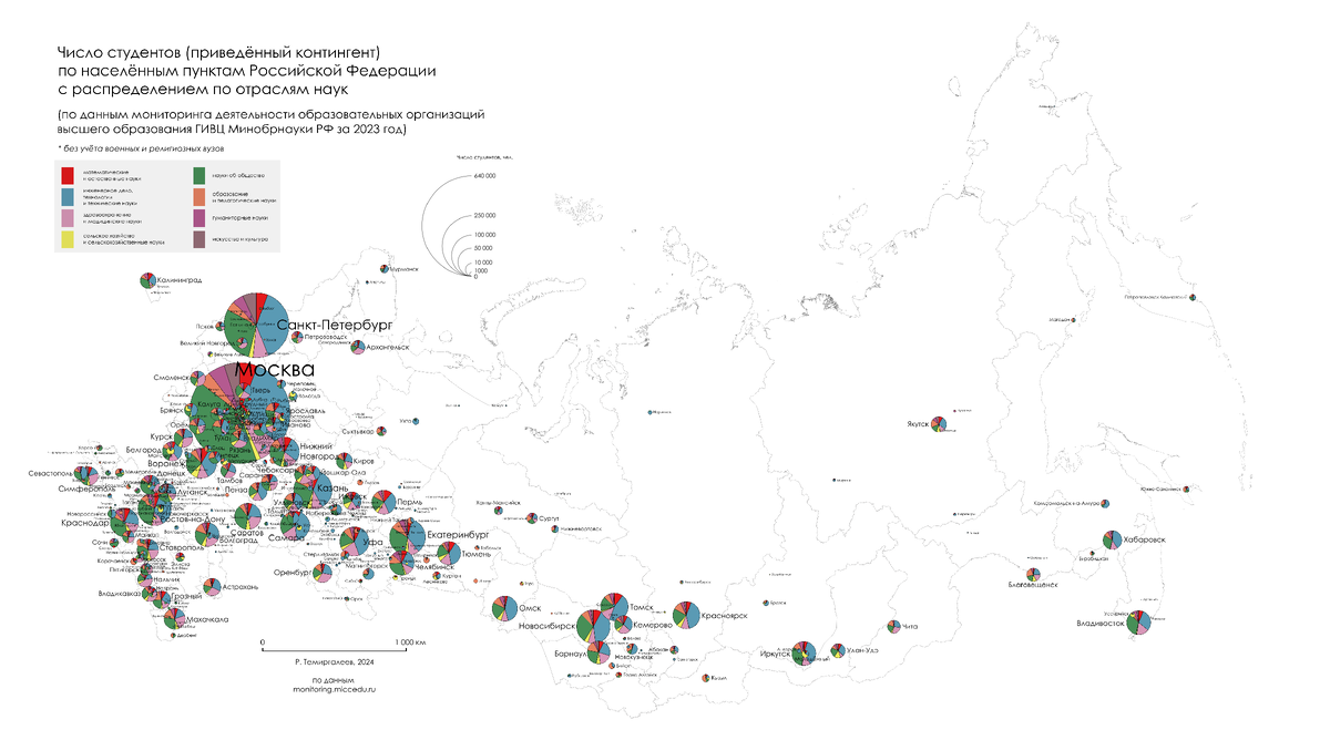 Помимо военных вузов, не учтённых в мониторинге изначально, автором дополнительно были исключены из исследования вузы конфессиональной направленности. Результатом стало составление сводной карты приведённого контингента студентов Б+С+М по населённым пунктам России.