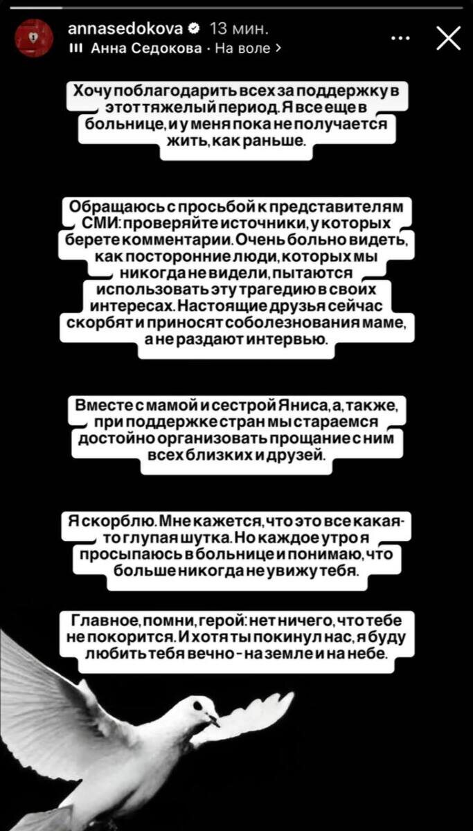 Анна Седокова и Янис Тимма были в браке четыре года. Минувшей осенью супруги сообщили о разводе. Инициатором расставания стала певица. Она объяснила, что отношения окончательно изжили себя и их не спасти. Спустя несколько недель после официального расторжение брака Янис покончил с собой. Перед тем, как пойти на роковой шаг, он оставил на телефоне запись с просьбой позвонить Анне. После всего пережитого она попала в клинику с нервным срывом и перестала выходить на связь с аудиторией. «Я скорблю. Мне кажется, что это все какая-то глупая шутка. Но каждое утро я просыпаюсь в больнице и понимаю, что больше никогда не увижу тебя. Главное, помни, герой: нет ничего, что тебе не покорится. И хотя ты покинул нас, я буду любить тебя вечно-на земле и на небе», — написала Седокова в личном блоге. Публикация Анны Седоковой. Фото: соцсети/ @annasedokova Также она ответила на слухи о том, что не участвует в организации похорон Тиммы. Отец спортсмена Райтис Тимма после смерти сына несколько раз резко в