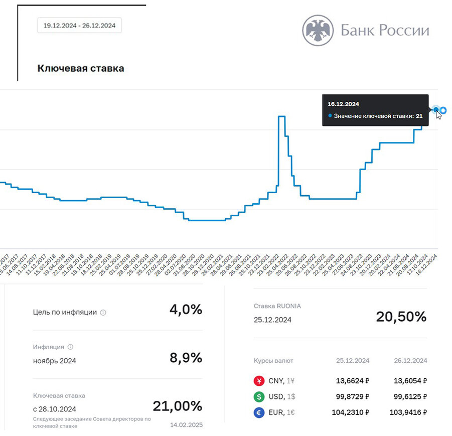 Эксперты прогнозировали повышение ключевой ставки Центробанка до 23-25%, но 20 декабря было принято решение сохранить уровень в 21%. Официально пояснено, что уже достигнута необходимая жесткость денежно-кредитных условий. Некоторые эксперты предполагают, что увеличения не случилось в связи с давлением бизнес-сообщества. Мнения о дальнейших мерах, которые будут предприняты в 2025 году, разделились от дальнейшего повышения ставки до 30% до снижения к уровню 18%.