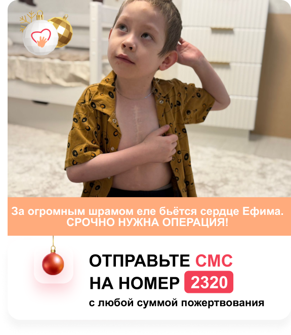 Сатурация не поднимается выше 80%. Малейшая активность приводит к одышке и ухудшению состояния. Ефиму срочно нужна операция, но в России семья получает лишь отказы. Состояние мальчика ухудшается. Только одна клиника может исправить сложнейший порок Ефима. Но стоимость операции огромна. Спасите Ефиму жизнь! Чудеса случаются если в них очень сильно верить. Семья маленького Ефима из Республики Коми сейчас живёт лишь верой в чудо. У Ефима опасный порок сердца, он нуждается в срочной операции, но в России её не делают. Всемирно известный кардиохирург Педро дель Нидо готов взять Ефима на радикальную коррекцию порока. Для этого в ближайшее время нужно оплатить счёт клиники. Помогите Ефиму, пока маленькое сердечко ещё бьётся! Первую операцию Ефиму провели сразу после рождения. Через месяц состоялась вторая операция. Состояние малютки не позволяло надолго откладывать очередной хирургическое вмешательство. «В 6 месяцев мы полетели на операцию Норвуда. К сожалению, у нас не получилось сразу сдела