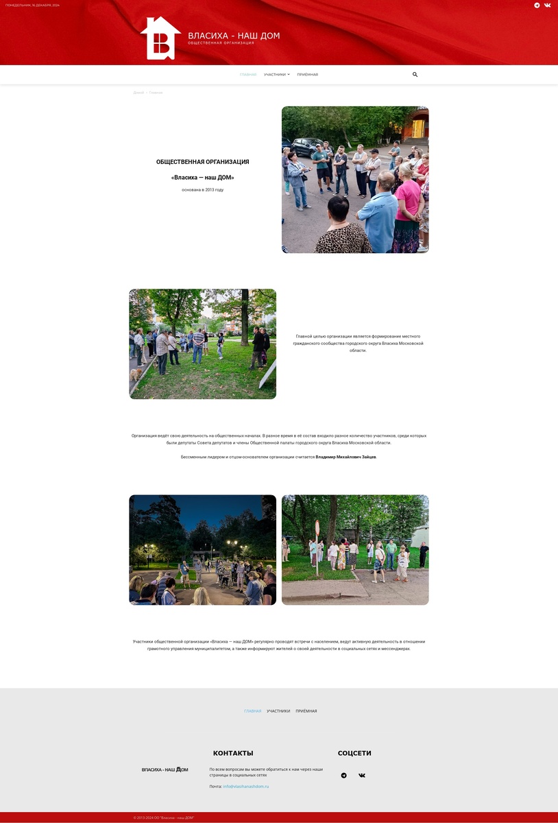 Ещё один web-проект от меня: https://vlasihanashdom.ru Общественная организация "Власиха - наш ДОМ" - практически объединение добровольцев. Первостепенная задача портала - ответ на вопрос: "Кто вы такие?" Традиционно использую легальную тему ThemeForest для Wordpress. Однако теперь содержание преимущественно формируется на плагине Elementor. Освоить все тонкости этого плагина непросто. Но в дальнейшем попробую запуск проектов исключительно на его основе. Удивительно, но одним из катализаторов создания сайта-визитки для организации был запрос к умной Яндекс-колонке о фамилиях некоторых участников. Не получив ни единого ответа, стало очевидно, что интернет до сих пор не знает ни имён, ни биографий, ни много ни мало, депутатов городского округа Власиха Московской области. Поэтому придётся на этим поработать. На сайте будут размещены сведения общего характера об участниках Общественной организации и способы связи с ними. Следующим этапом, при необходимости, будет подключена новостная лента