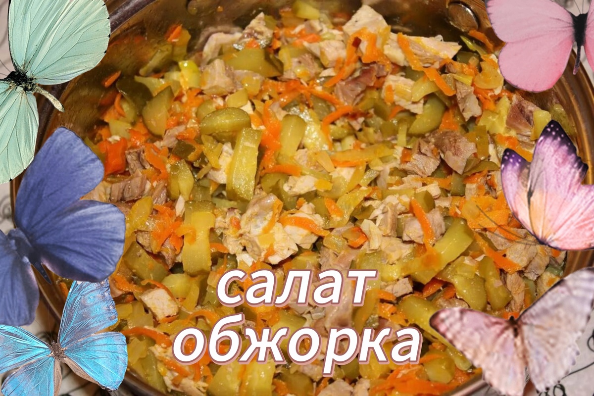 Очень вкусный и очень сытный мой любимый салат обжорка. Начинаем готовить: Отвариваем куриную грудку -200гр. На сковороде обжариваем натертую морковь, 1 шт, И лук нарезанный квадратиками 1шт, Солёные огурцы режем квадратиками -1, 2 шт. Нарезаем грудку кубиком Перемешиваем все ингредиенты и заправляем майонезом. Салат готов. Очень вкусный, готовьте не пожалеете.