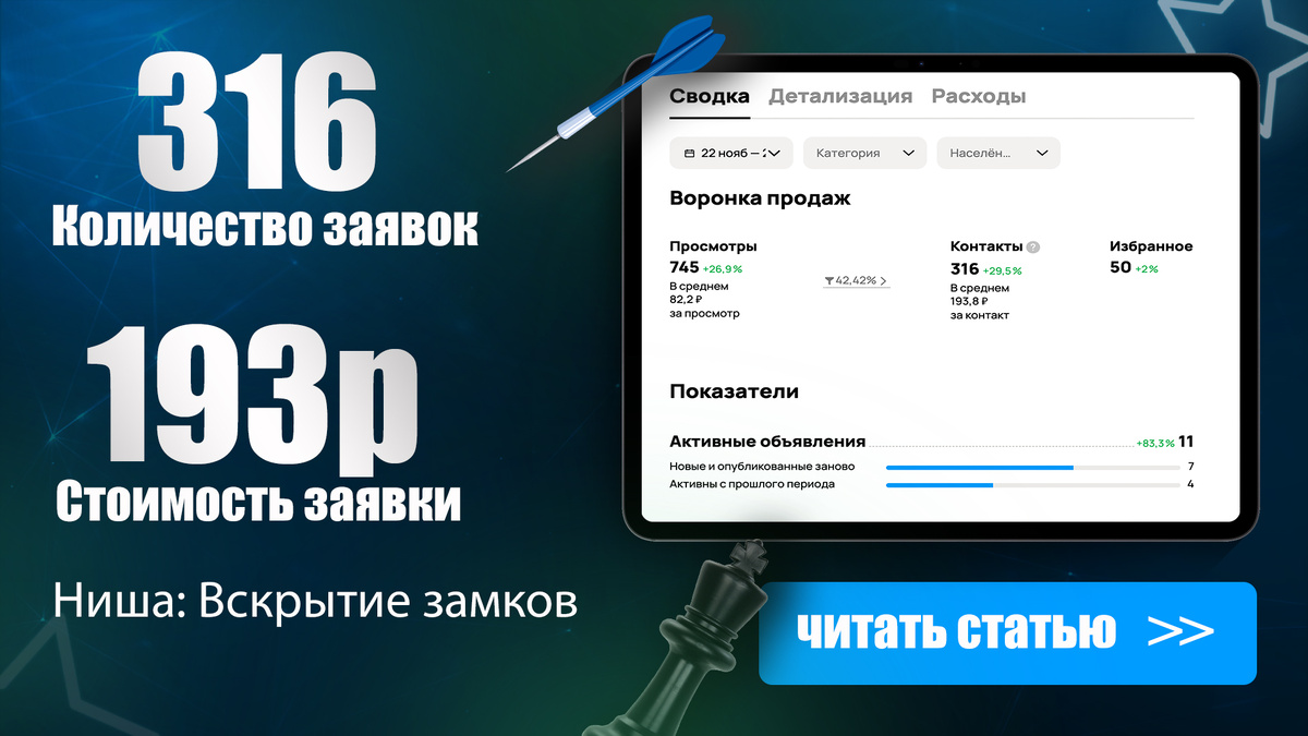 Цена контакта: 193р Статистика: Выводы: Основные выводы: Эффективное использование ресурсов и тестирование различных вариантов офферов, инфографики, ца и текстов помогли достичь значительного роста контактов. Хотите увеличить поток заявок и привлечь новых клиентов?