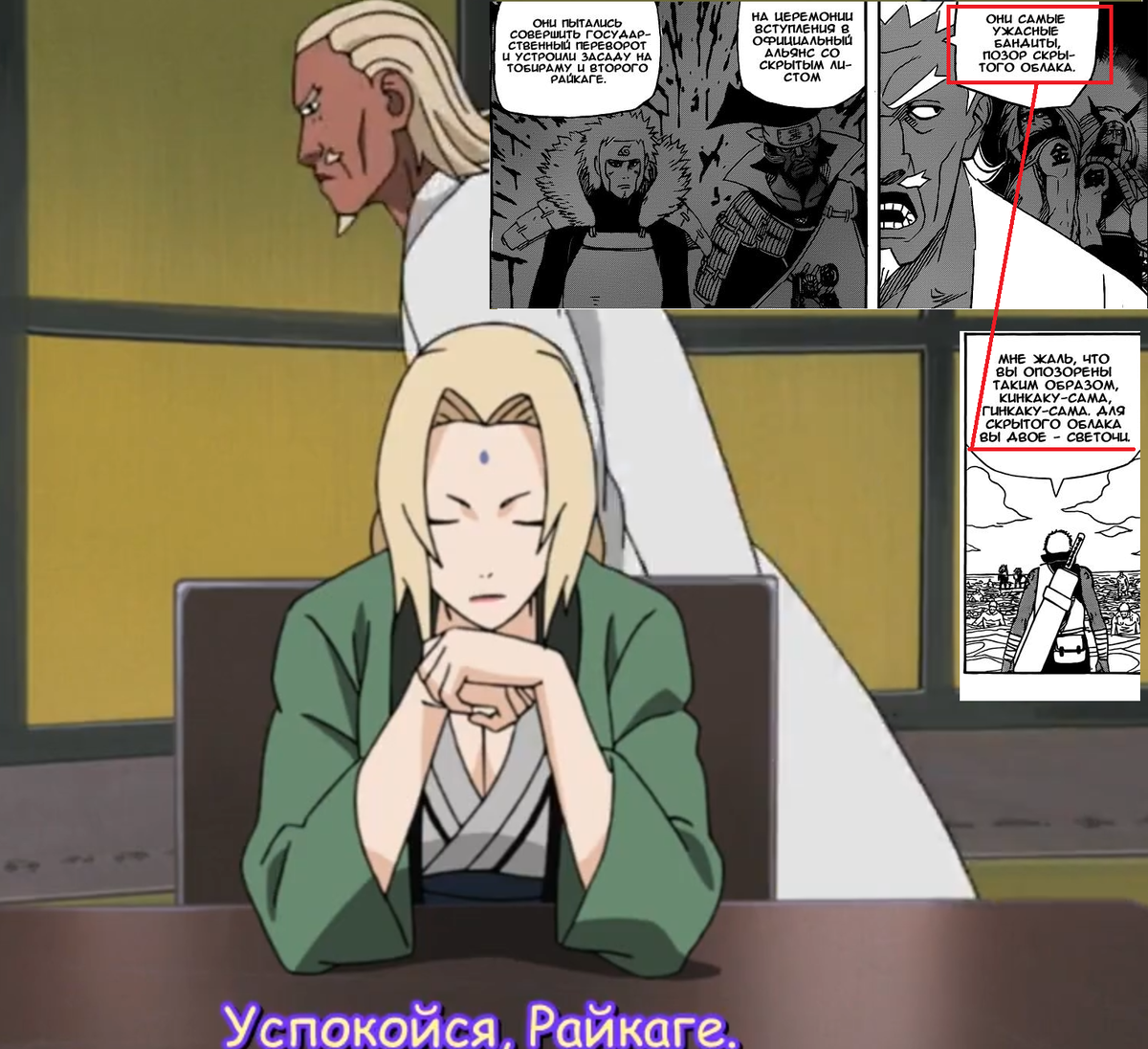 Знаете, если честно, я так и не уловил конечную мысль. Нарезая серию на скрины, я так же параллельно листаю мангу, а на некоторые моменты ещё держу или сверяю с английской версией, порой вижу, что в некоторых версиях откровенная чушь, но тут я даже не знаю: Даруи называет Братьев - СВЕТОЧАМИ Скрытого Облака, а Райкаге называет их ПОЗОРОМ. При этом, чуть позже, Даруи и сам назовёт их позором.