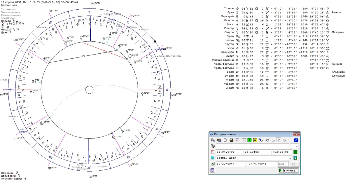 (Дальше - карта вопроса, Дайкс дает ее вероятные вводные: 15:19, 11 апреля 791 года, Басра, Ирак)