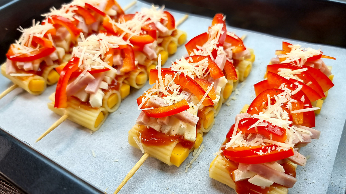 Самые обычные продукты, но необычная их подача делает ужин почти праздничным. Особенно нравятся такие "шашлычки" детям. Вкусно, быстро, просто! Ингредиенты: макароны крупные; сыр; томатный соус/кетчуп; моцарелла; ветчина;
