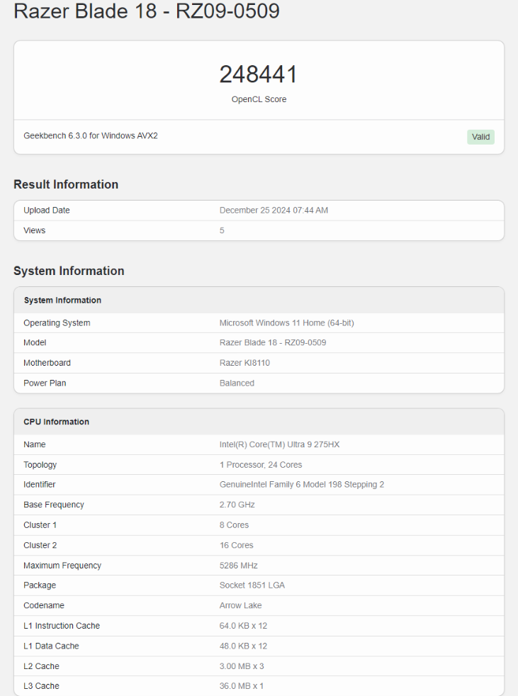 После запуска компанией Intel процессоров Arrow Lake для настольных ПК, Intel работает над мобильными вариантами чипов для запуска в начале 2025 года. Линейка Arrow Lake для мобильной платформы включает две разные серии: Core Ultra 200H и Core Ultra 200HX. Хотя несколько моделей из предыдущей серии появлялись в различных утечках, процессоры Core Ultra 200HX остаются более редкими. Один из высокопроизводительных процессоров в серии Arrow Lake-HX был протестирован на Geekbench, продемонстрировав умение Intel выпускать высокопроизводительные мобильные чипы. Процессор был замечен @BenchLeaks в составе игрового ноутбука Razer Blade 18, протестированного в Geekbench. К сожалению, результаты тестирования не были предоставлены. Однако модель процессора и его характеристики были раскрыты на странице «Информация о системе». Это процессор Intel Core Ultra 9 275HX, который является одной из топовых моделей в семействе Ultra 200HX и следует за флагманской модели Core Ultra 9 285HX. Процессор имеет