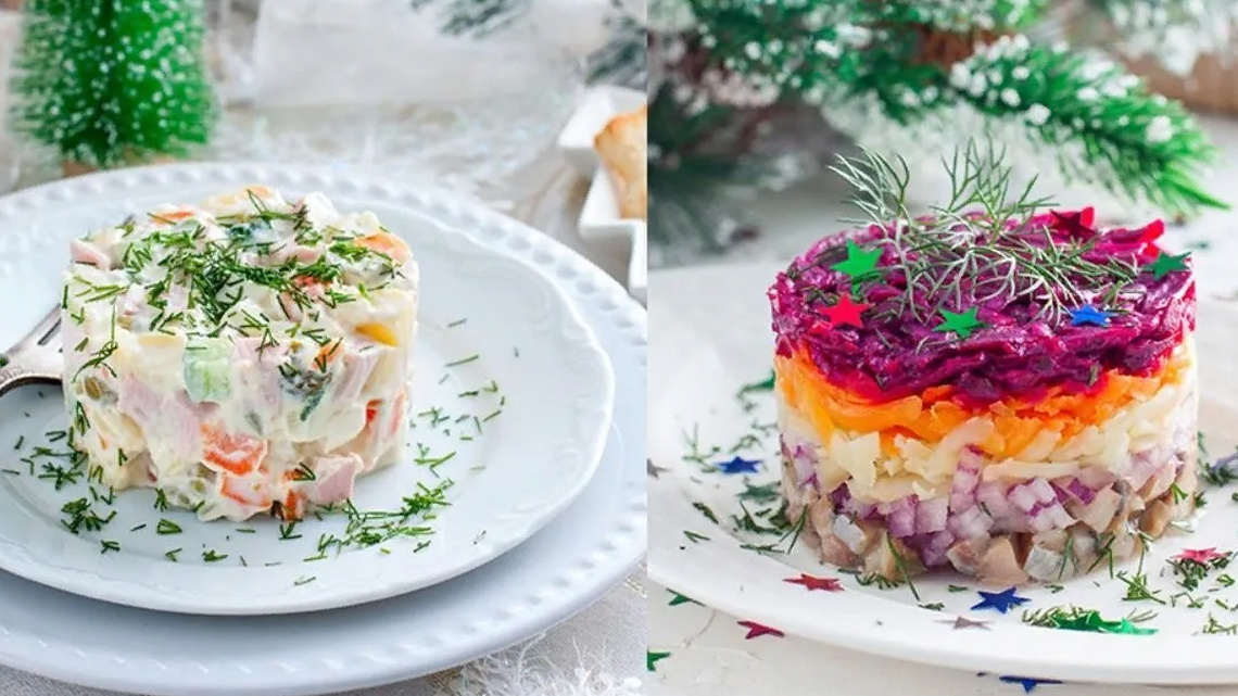 Новый год — это праздник, который невозможно представить без изысканных блюд на столе. Одним из главных украшений застолья в России всегда были и остаются салаты. В этой статье я расскажу о самых вкусных и популярных новогодних салатах, а также предложу интересные рецепты и варианты подачи. Салаты — это неотъемлемая часть праздничного стола в России. Их популярность объясняется несколькими причинами: История этих блюд уходит корнями в XIX век, когда рецепты заимствовались из европейской кухни. Например, "Оливье" впервые был представлен в ресторане "Эрмитаж" французским шеф-поваром Люсьеном Оливье. Это, безусловно, король всех новогодних салатов. Традиционный рецепт включает варёный картофель, морковь, яйца, солёные огурцы, зелёный горошек, колбасу или мясо, заправленные майонезом. Слоёный салат с селёдкой, свёклой, картофелем и морковью — настоящий хит праздничного стола. Этот салат идеально подойдёт тем, кто хочет включить в меню что-то полезное. Основу составляют варёные овощи: свёкл