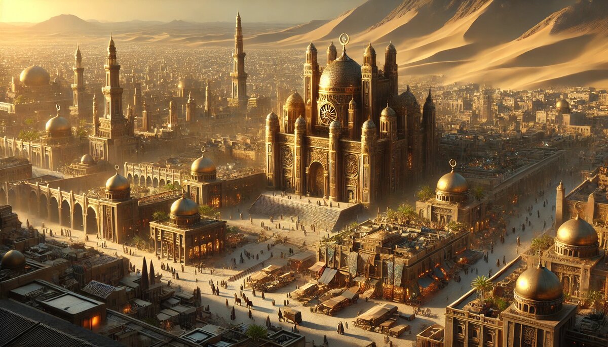 На юге от Срединного Королевства расположена Священная Халифия — богатое и величественное государство, чья столица Альджариз, также известная как Бронзовый Город, славится своими куполами, сверкающими в солнечном свете, и атмосферой экзотики. Это царство контрастов: роскошь соседствует с бедностью, религиозная строгость — с жестокими развлечениями. Священной Халифией правит великий халиф Наэль-Даяд, обладающий абсолютной и неделимой властью. Халиф не только глава государства, но и духовный лидер, чьи решения считаются неоспоримыми. Управление страной осуществляется через разветвлённую систему визирей, которые отвечают за экономику, юстицию, внешнюю политику и оборону. Однако их власть ограничена строгими приказами и личным контролем со стороны халифа. Рабство в Халифии официально разрешено, как и в соседней Могульской Империи, что делает его не столько дикостью, сколько частью повседневной жизни. Работорговля процветает, особенно в столице, где невольников используют как для физическог