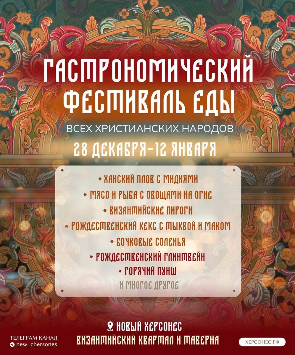 Гастрономический фестиваль, посвящённый блюдам всех христианских народов, пройдёт в Новом Херсонесе. В преддверии рождественских каникул, начиная с 28 декабря, в Византийском квартале Нового Херсонеса и на территории Свято-Владимирского Херсонесского мужского монастыря состоится уникальный гастрономический фестиваль, который представит разнообразные постные и непостные блюда. Одной из ключевых особенностей этого фестиваля станет возможность насладиться приготовлением блюд на открытом огне. Команда ресторана «Таверна 988» разработала специальное меню, вдохновленное легендами прошлых веков и традициями гостеприимной крымской земли. Постный плов с пряными травами, лепешки, приготовленные византийскими мастерами с мясом или курицей, императорские лепешки с рваным мясом и овощами, птица по-византийски, рыба, запеченная на углях, рождественский кекс с тыквой и маком, а также настоящие бочковые соленья — это лишь малая часть кулинарных шедевров, которые ждут вас на этом замечательном фестивал