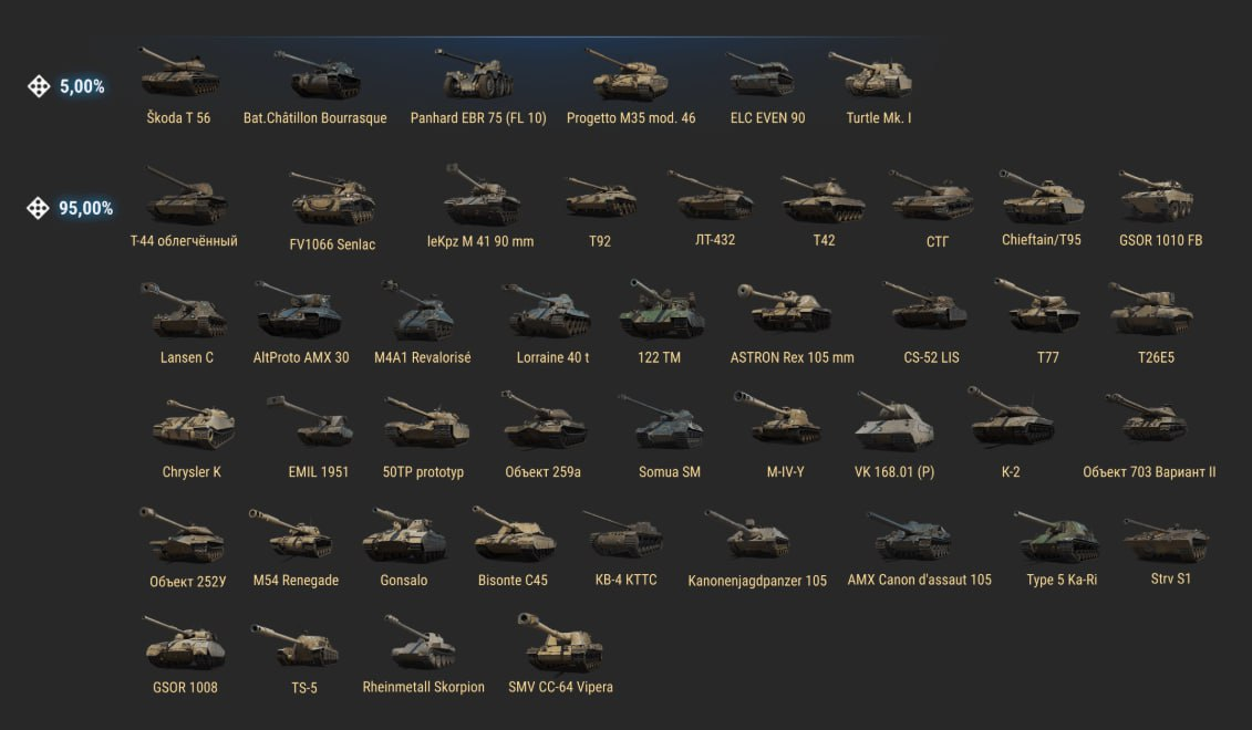 Поэтому здесь мы поговорим только про регулярный пул, то есть 95%. Именно эти машины будут падать чаще всего. И так как здесь есть все классы премов (кроме Об. 156 О), то и топа будет 4 по цене 1, таки выгодно!
