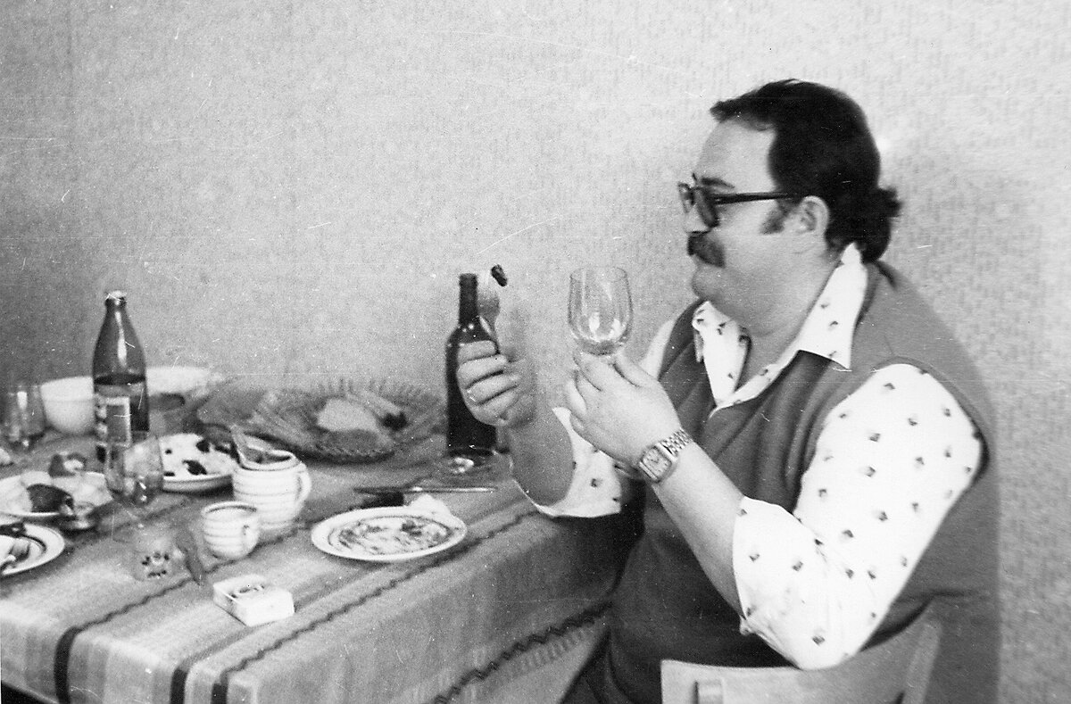 Григорий Иоффе Аркадий Матвеевич Спичка, уже гурман, но еще не автор знаменитой «Кухни холостяка», подает нам новогодний сигнал из прошлого: пора готовиться к праздникам! Ну, насчет новогоднего сигнала, признаюсь, выпалил для красного словца, потому что снимок этот сделан отнюдь не в Новый год, а в августе 1978-го, когда Аркадий Матвеевич заглянул ко мне в гости с бутылочкой недорогого портвейна, и уже успел поднять бокал, когда я успел зафиксировать его в любимой позе. Умение красиво выпивать и столь же изящно закусывать дается человеку от природы. Иного сколь ни муштруй всяческими этикетами и бонтонами, он все равно втихаря, да еще с забубенными собутыльниками («а там друзья, ведь я же, Зин, не пью один»), будет пить водку из граненого стакана, позаимствованного у автомата с газводой, и закусывать селедкой, распятой на свежем номере газеты «Правда». Однако, вот мы и в прошлом веке. У нас, рожденных, как это принято теперь говорить, в СССР, куда ни кинь, за что ни возьмись, все равно