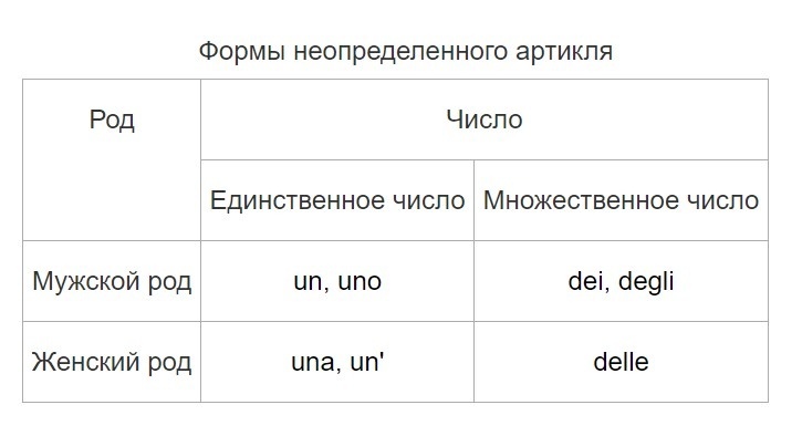 В итальянском языке, так же как и в английском, имеются «любимые» многими артикли. Рассмотрим формы неопределенного артикля и ситуации, когда он нужен В мужском роде в единственном числе неопределенный артикль имеет две формы: uno – для существительных, начинающихся с s+согласная или c z и un – для всех остальных. Примеры: Un ragazzo – мальчик Un amico –друг Uno zio – дядя (существительное начинается на «z») Uno studente – студент (существительное начинается на «s+согласная») Если же мы хотим употребить существительное мужского рода во множественном числе, используем формы неопределенного артикля: degli – для слов, начинающихся с гласной, с s+согласная или с z и dei – для всех остальных. Примеры: Dei ragazzi – мальчики Degli amici –друзья (существительное начинается с гласной) Degli zio – дяди (существительное начинается на «z») Degli studenti – студенты (существительное начинается на «s+согласная») Для женского рода все намного проще! Артикль una используется перед существительными, н