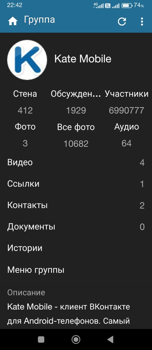 Здравствуйте. Сегодня хочу рассказать о приложении Kate Mobile. Клиенте ВКонтакте. Скачать его можно на Плей маркете. Это тоже самое ВКонтакте только весит меньше, адаптировано под большинство гаджетов и имеет все плюсы оригинала, при этом убрано всё лишние, мешающие большинству пользователей. У них есть свое сообщество во ВКонтакте. Kate будет показывать вам только то, что у вас есть или добавлено лично вами. Никаких левых новостей, видео, аудио и групп. Всё только ваше. Да, звучит идеально и верится с трудом, но это правда! Если вам нужно что-то найти и добавить, вы можете сделать это в поиске. Он удобно поделён на темы, поиск групп, видео, аудио и тд. Реклама есть, например при перелистывании ваших новостей, но куда же без неё? Ваш профиль тоже стал удобнее, вы можете сразу переходить в нужный вам раздел, например в закладки. И есть фишка которой нет в оригинале, просто бомба! Можно смотреть любую стену, как свою так и чужую, начиная с самой первой пуб