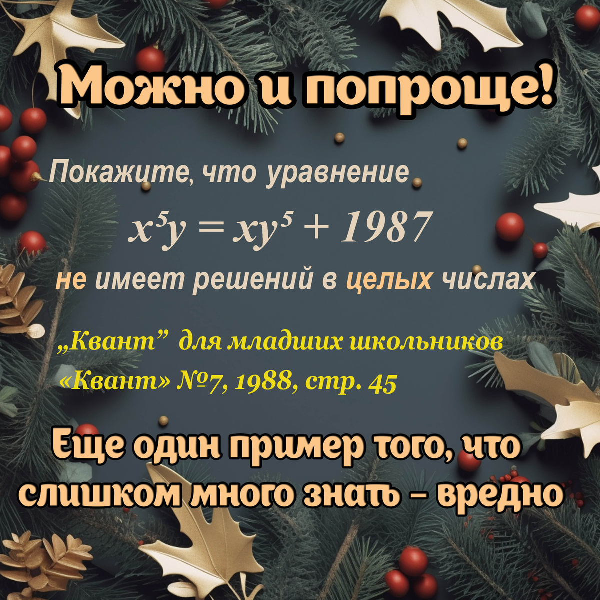Журнал «Квант», некогда слыл пособием для начинающих академиков. Куда мне до таковых! Меня и начинающим назовешь с трудом, не говоря уж об академиках. Вот «„Квант" для младших школьников» — это можно! Беру наугад №7 1988 года, нахожу желанную страницу и читаю: Покажите, что уравнение x⁵y = xy⁵ + 1987 не имеет решений в целых числах. Нет проблем! Тем более, что есть подсказка, избавляющая от поиска несуществующего решения. Видимо, пощадил автор задачи младших школьников, не желая травмировать юные головы. Не буду и себя травмировать, решая легко и свободно. Переносим xy⁵ влево и получаем в левой части двучлен x⁵y – xy⁵, который без труда разлагается на множители: x⁵y – xy⁵ = xy (x⁴–y⁴) = xy (x²–y²)(x²+y²) = xy (x–y)(x+y)(x²+y²) Таким образом приходим к уравнению xy (x–y)(x+y)(x²+y²) = 1987 и остается лишь разложить на множители число 1987. Числа 2, 3, 5 явно не делители. Может на 7? — Нет не делится. На 11 можно даже не пробовать, так как 198 на 1