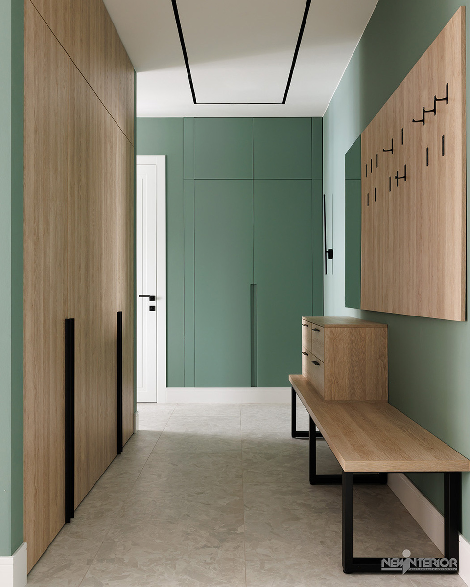 Холл — это не просто прихожая, а просторное помещение, в котором предусмотрено множество мест для хранения. Эта задача была поставлена заказчиками, и мы успешно её выполнили. Особое внимание мы уделили освещению. В потолок встроены трековые светильники с безободковым дизайном. Их конструкция обеспечивает мягкий, направленный свет, при этом софиты не выступают за пределы треков, что визуально облегчает пространство. Для дополнительного удобства в холле установлены настенные бра, но люстра отсутствует — такой подход делает интерьер более лёгким и современным. Пол в холле выполнен из керамогранита крупного формата (60 × 120 см). Вместо традиционного материала под терраццо, который стал уже привычным, мы использовали более современную и модную коллекцию. По периметру установлен видимый белый плинтус, который контрастирует с зелёными стенами. Скамья, расположенная в зоне входа, — это не только стильное, но и функциональное решение. На ней удобно переобуваться, а рядом с сиденьем предусмотре