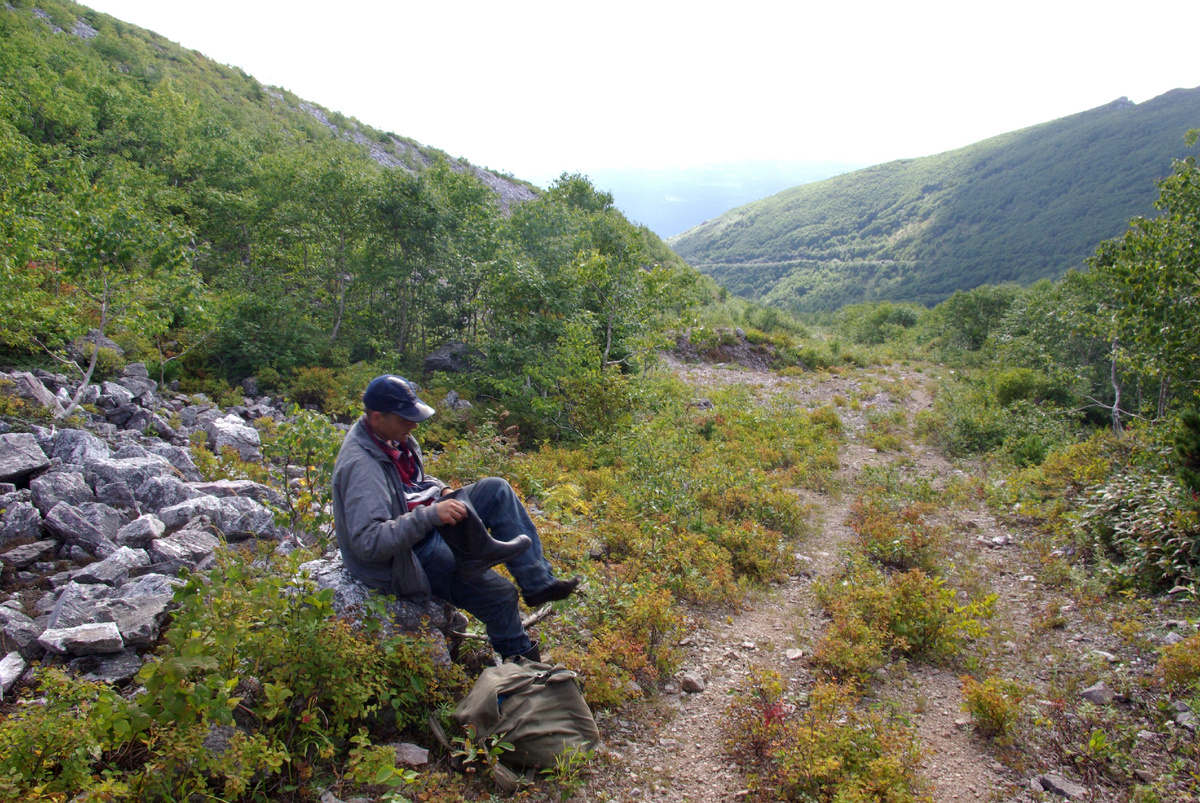 Хорошо помню тот поход до сих пор: как-никак, новые впечатления. Ушло времени: от трассы до горы 5 часов вверх, 3,5 часа вниз. Тогда автобусы по маршруту № 177 не ходили, а 174-ый был не скоро после нашего выхода на Охотскую трассу. Поэтому Андрей предложил дополнительно пройти пешком 4 с небольшим километра вдоль трассы, чтобы выйти в Лиственничное, а оттуда уехать на автобусе № 115. Было воскресенье, и за 2 км до развилки на Корсаков образовалась огромная пробка, авто тащились с одной скоростью с нами. Но в любом случае, по времени мы тогда выгадали.