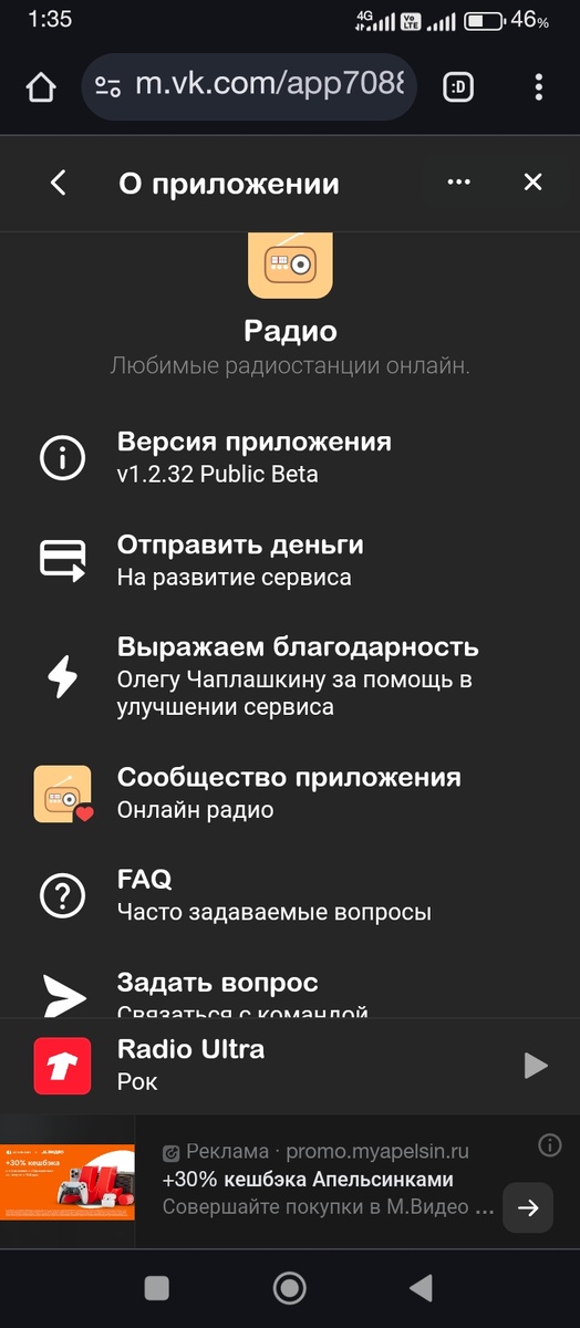 Здравствуйте. Хочу рассказать о приложении ВКонтакте, о радио. Чем оно удобно? В нём есть такие станции которых нет в обычном радиоприёмнике. Например моя любимая станция Ультра давно перешла на вещание в интернете. У каждой станции есть описание какую именно музыку она играет, что очень удобно. Приложение работает как во ВКонтакте, так и в Kate Mobile. Можно слушать в фоновом режиме. Приложение качественное, у меня оно ещё ни разу не лагало, сигнал отличный. Рекомендую.