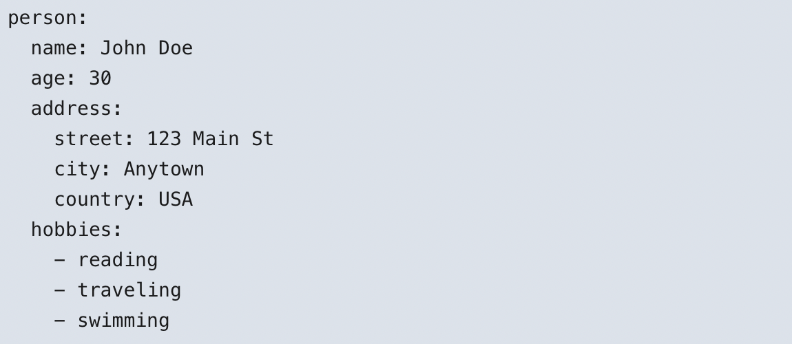 YAML (YAML Ain't Markup Language) — это формат сериализации данных, который используется для представления структурированных данных в удобочитаемом виде. Он был разработан для простоты и ясности, что делает его особенно популярным в таких областях, как конфигурация приложений, обмен данными между языками программирования и хранение данных. YAML использует отступы для представления вложенности. Пример: В этом примере мы видим, как информация о человеке представлена в виде иерархической структуры. person является объектом, который содержит поля name, age, address и hobbies. Поле address само является объектом с вложенными полями. Преимущества: Недостатки: YAML — это мощный инструмент для представления и обмена структурированными данными. Его простота и читаемость делают его особенно полезным в разработке программного обеспечения, настройке систем и обмене данными. Хотя у него есть свои недостатки, его преимущества делают его популярным выбором для многих разработчиков и системных админи