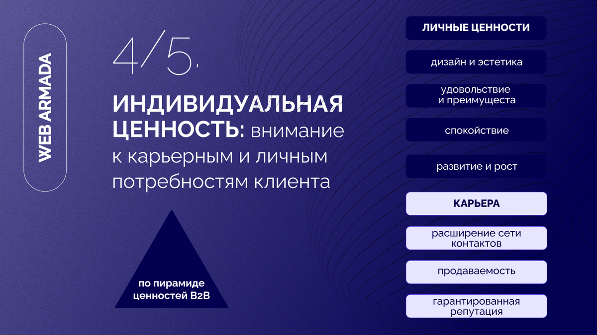 На этом уровне пирамида обращается к личным потребностям клиента. В B2B-секторе за решения отвечают люди, и они ценят элементы, которые помогают им добиваться карьерного роста и личного комфорта. Это гарантированная репутация, расширение сети контактов, развитие и рост. Верхние уровни пирамиды ценностей B2B фокусируются на глубокой мотивации и эмоциональной связи клиента с продуктом или услугой. Эти уровни выходят за рамки функциональности или удобства и сосредотачиваются на создании личной и вдохновляющей ценности для клиента. Индивидуальная ценность: внимание к карьерным и личным потребностям клиента Индивидуальная ценность направлена на удовлетворение личных целей клиента, которые могут касаться как карьеры, так и личного роста. Здесь важно учитывать не только интересы компании-клиента, но и мотивацию ключевых лиц, принимающих решения. Как внедрить личные ценности в работу B2B: Как внедрить карьерные ценности в работу B2B: 1. Расширение сети контактов 2. Продаваемость 3. Гарантирова
