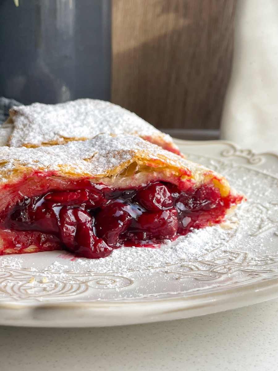 Очень вкусный, сочный и простой в приготовлении! Ингредиенты: Перемешать вишню с сахаром и крахмалом. Поставить на средний огонь и уварить до загустения, постоянно помешивая. Соединить 2 пласта теста и раскатать. На один край выложить начинку и завернуть в рулет, как на видео: Удобнее это делать сразу на пергаментной бумаге. Защипнуть края. Смазать яйцом и отправить в духовку. Выпекать 35-40 минут при 180 градусах до румяного цвета. Дать немного остыть и посыпать сахарной пудрой. Приятного аппетита!