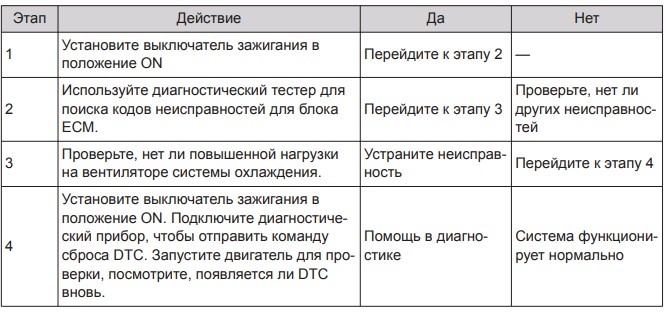 Определение кода неисправности: тип 1 неисправности сигнала вентилятора охлаждения системы охлаждения. Условия появления кода неисправности: тип 2 неисправности сигнала обратной связи вентилятора.