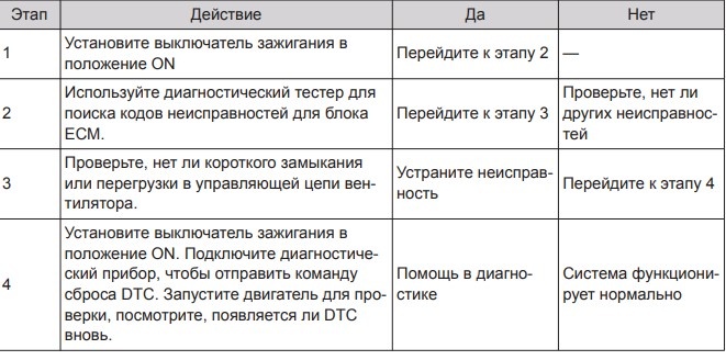 Определение кода неисправности: тип 4 неисправности сигнала вентилятора системы охлаждения двигателя. Условия появления кода неисправности: тип 4 сигнала обратной связи вентилятора.