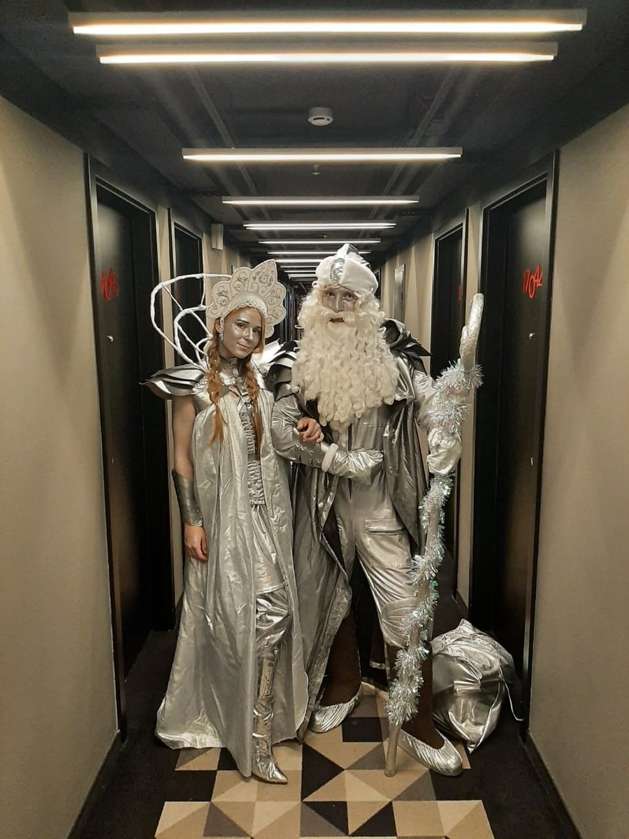 Эти же герои Питерского корпоратива выглядят почти так - в серебре-металле, очень непривычно, выбиваясь из традиционного представления о Деде Морозе и Снегурочке.