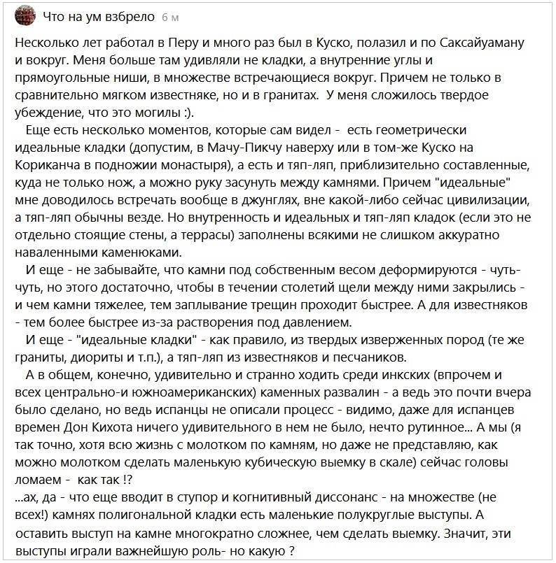 Испанцы, конечно же удивлялись и возхищались инкскими постройками. Но более всего их интересовало то, что индейцы их созидали, не зная ни колеса, ни волов. При них местные каменотёсы уже не создавали чудесной полигоналки, ибо работали для европейцев. Но они, строя церкви и дома для тех же испанцев, поначалу выполняли работу "дедовскими" методами, правда, довольно быстро перешли на европейский инструмент. Навскидку не помню, у кого из хронистов имеется описание их работы. (может быть позже это место дополню).