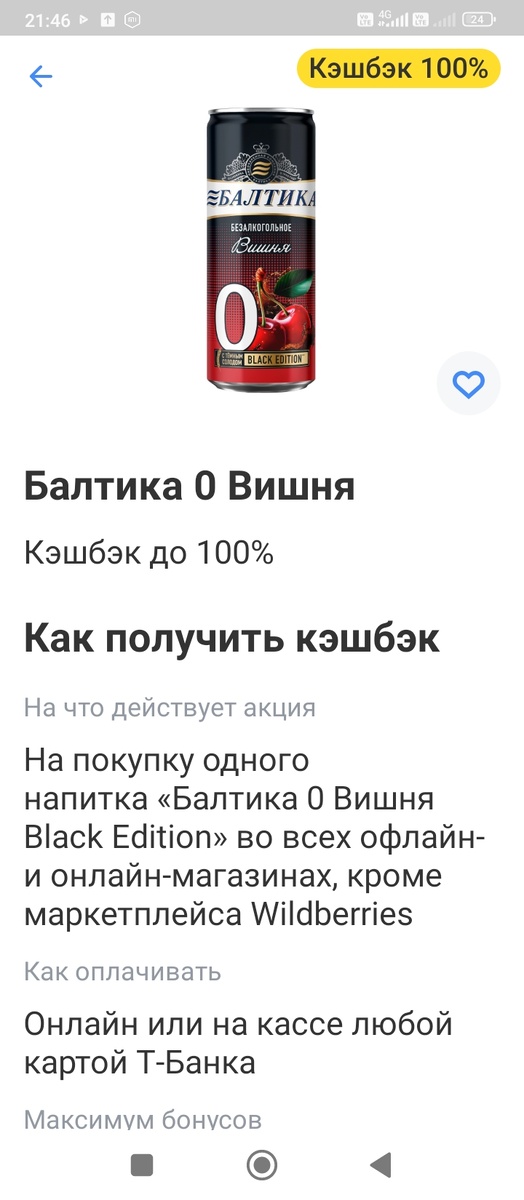 Привет, друзья ! Производители различных товаров просто спят и видят как бы раскрутить нас на покупку того, что нам не надо или без чего мы вполне можем обойтись. Уж на что я равнодушна к спонтанным покупкам, но вот не удержалась, увидев предложения о "💯 %-м кешбеке". В чем была моя ошибка? В том, что я плохо условия акции прочла. Написано же было "на покупку одного напитка", я же потянулась и купила 2е , хотя мне и одной то не надо было😁😍😍 Потратила на 2 банки 142 рубля, и это при том, что вообще не пью все эти лимонады. Но тут же сладкое слово "халява".😁😁😁 Пришла домой, попробовали- это простой лимонад с вишнёвым вкусом. Пена как у пива, вкус как у вишнёвого сока. И настолько сладко, что аж зубы сводит. Стала я пробовать вернуть кешбек. Сначала не получилось подгрузить чек в Т-банк. Потом все же получилось. Вернули мне 60 рублей. И все равно не 100% вернули, даже одна банка бесплатной не оказалась, а у меня ещё вторая теперь стоит, которую я от жадности купила😁😁😁 Короче