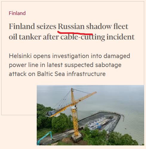 Финские власти захватили нефтяной танкер, который, по их мнению, был причастен к повреждению подводного кабеля между Финляндией и Эстонией. Власти заявили, что захваченное судно является частью так называемого теневого флота России. Это заявление было сделано через день после того, как был перерезан подводный энергокабель Estlink 2, по которому передается электроэнергия между Финляндией и Эстонией, что вызвало обеспокоенность по поводу безопасности кабелей в Балтийском море.