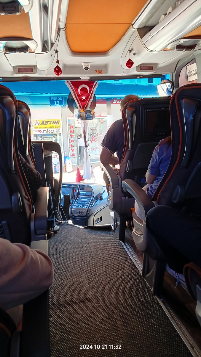 Поскольку отель наш в Аланье находился рядом с автовокзалом, то нам не пришлось долго добираться и искать где купить билеты до Анталии. В кассе alanyalilar продавались только билеты на экспресс. Едет быстрее, но автобус маленький и чемоданы наши туда не засунуть. Пришлось покупать билеты в Akdeniz. Цена такая же как и туда - 200 лир с человека. Автобус большой, более комфортный. В одном ряду по 2 места, во втором по одному. В 11-30 выехали в Анталию.