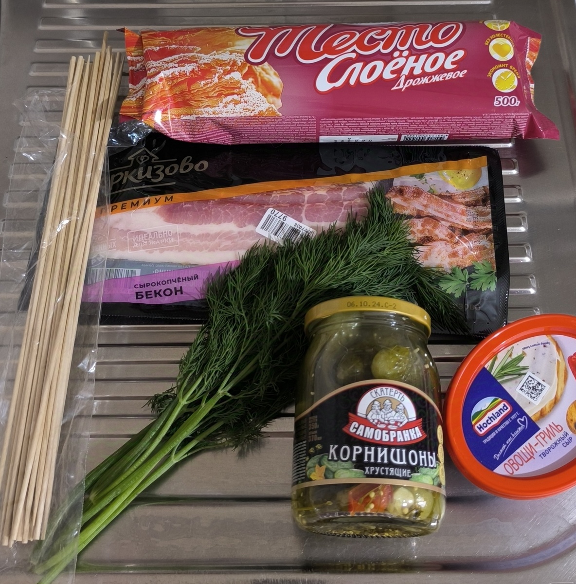 Такие слойки несомненно украсят ваш праздничный стол, к тому же они получаются очень вкусными. Приготовить их сможет даже школьник, причем за считанные минуты. Ингредиенты: - тесто слоёное дрожжевое 500 грамм - сыр сливочный творожный 60 грамм - бекон сырокопченый 150 грамм - укроп свежий 30 грамм - оливки, маслины или маринованные огурцы для украшения Слоёное тесто полностью разморозить. Тесто разрезать на 2 равные части. Зелень тщательно помыть, обсушить и мелко нарезать. Раскатать каждую часть в прямоугольник толщиной около 3 миллиметра. На одну часть теста нанести равномерно слой сливочного сыра. Равномерно распределить укроп. Выложить бекон. Накрыть вторым слоем теста и слегка прижать. Нарезать тесто с начинкой на полоски шириной 2-3 сантиметра. Сформировать ёлочки. Проткнуть ёлочку насквозь деревянной шпажкой, так, чтобы сверху шпажка вышла из теста на 2 сантиметра. Для того чтобы сформировать веночки полоску теста аккуратно перекручиваем, чтобы получились спиральки. Закр