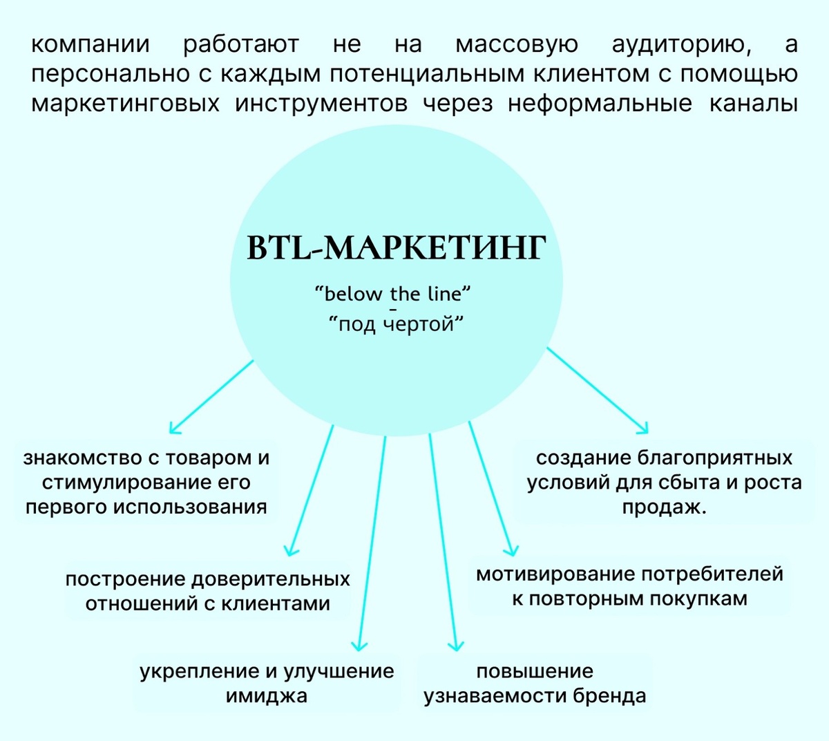 BTL – это комплекс различных маркетинговых коммуникаций, мероприятий и инструментов, с помощью которых компании выстраивают свои отношения и взаимодействия не на массовую аудиторию, а персонально с каждым потенциальным клиентом через неформальные каналы. Это позволяет выстроить с целевой аудиторией доверительные и взаимовыгодные отношения, так как обе стороны – компания и потребитель получают обратную связь и ответную реакцию по товару или услуге, что способствует грамотному подходу и учитыванию всех мнений и предпочтений. Данный вид маркетинга включает в себя прямые контакты через различные промоакции, event-мероприятия, мерчендайзинг, email-рассылки, семплинг и многое другое.