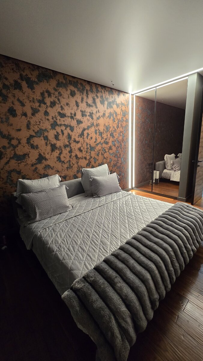 Большинство интерьеров спален светлые, это практиковалось много лет, с учетом небольших размеров комнат. Считается, что светлый цвет увеличивает пространство. Но если подойти к оформлению спальни с толком, грамотно подобрать цвет, освещение, использовать другие приемчики, можно получить необычное, стильное, современное пространство спальни. Темная спальня делает яркий акцент на индивидуальность, личное, интимное, эксклюзивное пространство, атмосферу гармонии и благополучия. Темный интерьер спальни не означает использование только темного цвета, а наоборот, можно добавить контраста, в виде светлых элементов. Такой интерьер будет шикарным как при искусственном, так и при естественном освещении, он будет разным и по-своему интересным. Успешность интерьера темной спальни в выборе глубокого цвета, разбавленного светлым контрастным акцентом (большая кровать), применение разнородных фактур, с вовлечением материалов различных текстур. Как вам такой вариант? Еще больше интерьерных решений в наш
