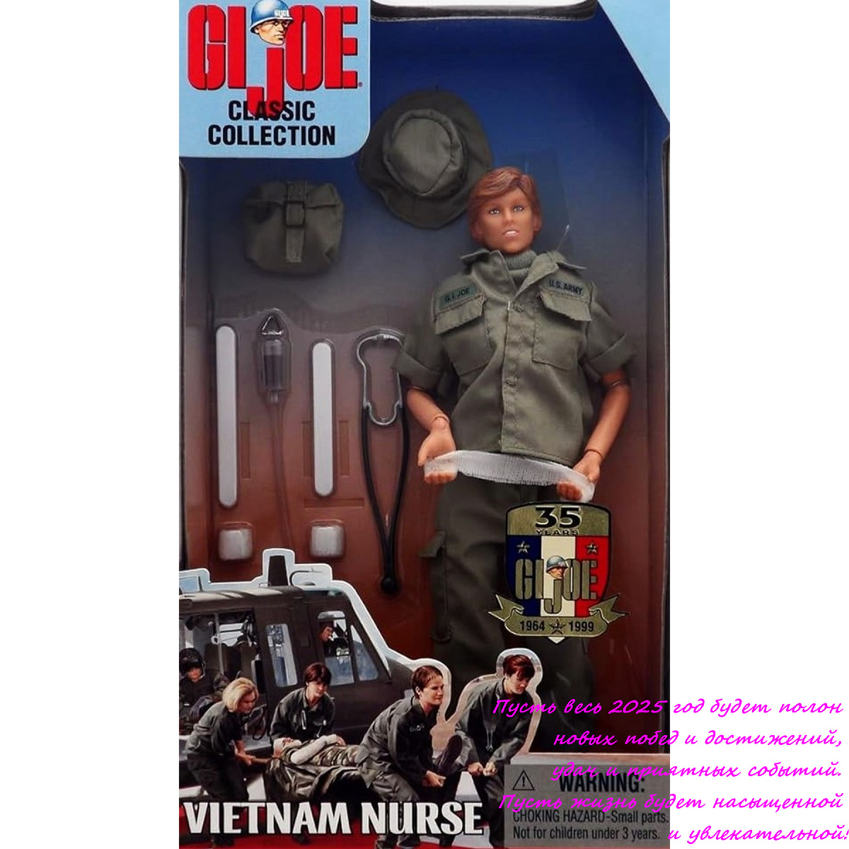 Здравствуйте, дорогие зрители и читатели! Продолжаю перепись КуклоНаселения моего Кукольного Паноптикума с новогодним настроением. Продолжаю снимать портреты кукол у елочки🎄 В кукольный набор вьетнамской медсестры 1999 года выпуска входит 12-дюймовая фигурка Джи-И-Джейн, и 12-дюймовые аксессуары для игры: кепка, жетоны, футболка, сорочка, брюки, ботинки, стетоскоп, марлевые полоски, аппарат для внутривенного вливания, шины и медицинская сумка. Куклы выпускались разных рас и с различной окраской волос. Первые американские солдаты были задействованы во Вьетнамской войне в 1962 году, когда морские пехотинцы заняли позиции в Меконге. Дельта. Как ни один другой конфликт до нее, война во Вьетнаме стала серьезным испытанием для решимости рядовых американцев. «Среди американских героев, служивших во Вьетнаме, были солдаты, чьей миссией было не сражаться, а утешать и исцелять. Это были американские военные медсестры. В марте 1962 года тринадцать армейских медсестер прибыли в Восьмой полевой го
