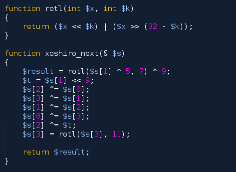 У меня внеочередной проект игры, который предполагалось сделать за день или два. Анонсирую его позже. Однако, начав писать прототип, я сразу же зарылся в одну проблему. Игра онлайновая, поэтому серверная часть делается на PHP. Игра использует генератор случайных чисел, текущее состояние которого должно сохраняться между ходами. То есть у каждого игрока должна быть своя отдельная сессия игры, где используется своё отдельное состояние генератора. Встроенная в PHP функция mt_rand() не позволяет получить текущее состояние, поэтому я обратился к самописному генератору. В качестве основы я взял уже зарекомендовавший себя алгоритм xoshiro: Но реализовать его в PHP оказалось не так просто. Итак, для начала я просто перенёс код в PHP: Но при попытке его использовать сразу возникла ошибка. Вместо целых чисел стали получаться вещественные. Проблема в том, что в PHP нет ограничения на длину целого числа. При переполнении оно автоматически превращается в вещественное с плавающей точкой. Алгоритм, р