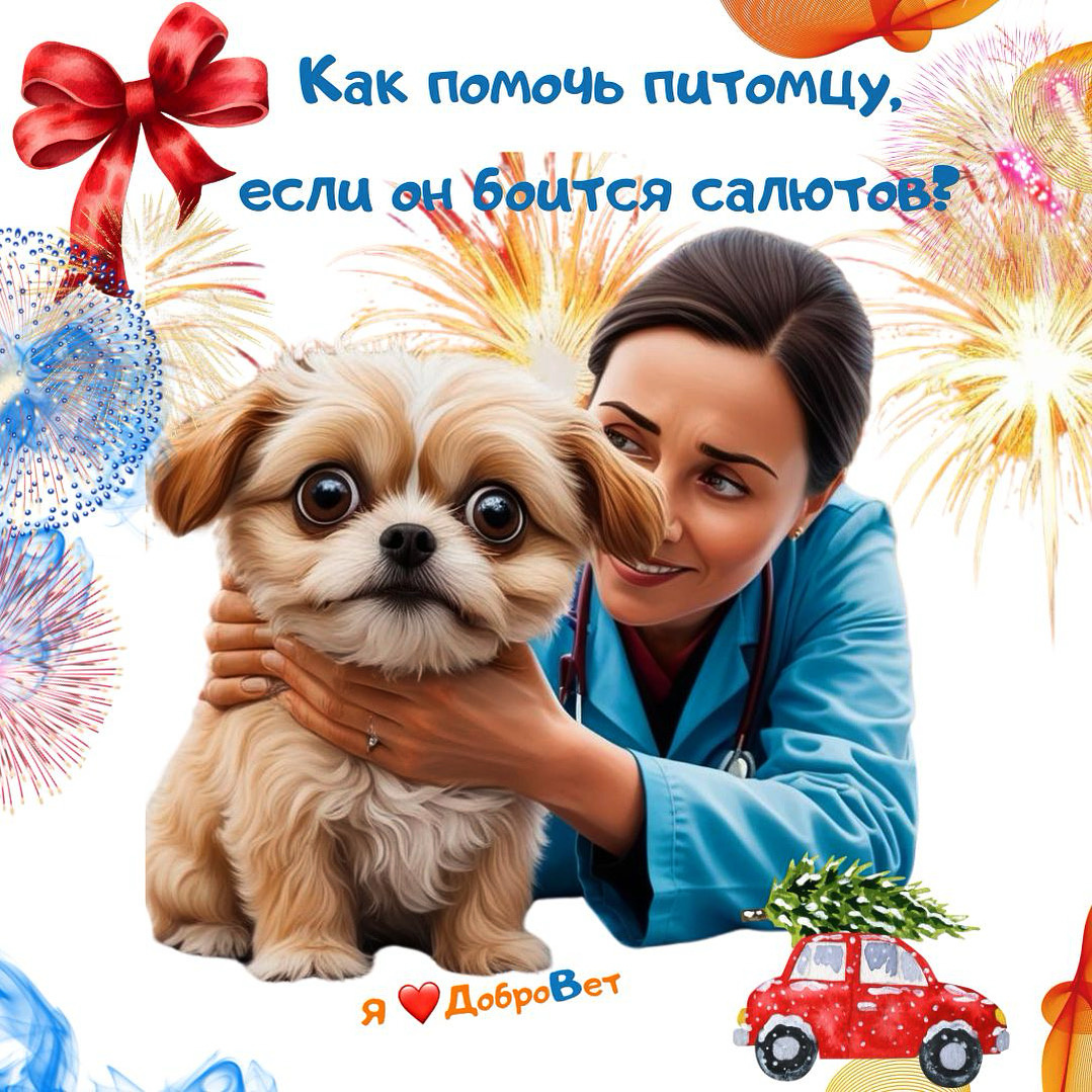 🎇🐾 Как помочь питомцу, если он боится салютов? Советы ветеринарного врача! 🐾🎇 🎄Каждый год, когда наступают праздники, мы радуемся фейерверкам и салютам, но для наших пушистых друзей это часто становится настоящим стрессом! 🥺💔 Громкие звуки и яркие вспышки могут вызвать у них страх и тревогу. Вот несколько советов от ветеринарного врача #ДоброВет, как помочь вашему питомцу пережить этот период с минимальным стрессом. 1️⃣ Создайте уютное укрытие⛺️: Подготовьте для питомца укромный уголок в доме, куда он сможет спрятаться во время фейерверков. Это может быть корзинка с его любимыми одеялами или специальная палатка. Убедитесь, что там тихо и темно. 2️⃣ Не оставляйте питомца одного😿: Постарайтесь находиться рядом с вашим другом в момент громких звуков. Ваше присутствие и поддержка могут значительно облегчить его страх. Гладьте его, разговаривайте и успокаивайте. 💖 3️⃣ Используйте феромоны: Специальные феромоновые спреи и диффузоры могут помочь расслабить вашего питомца. Они на