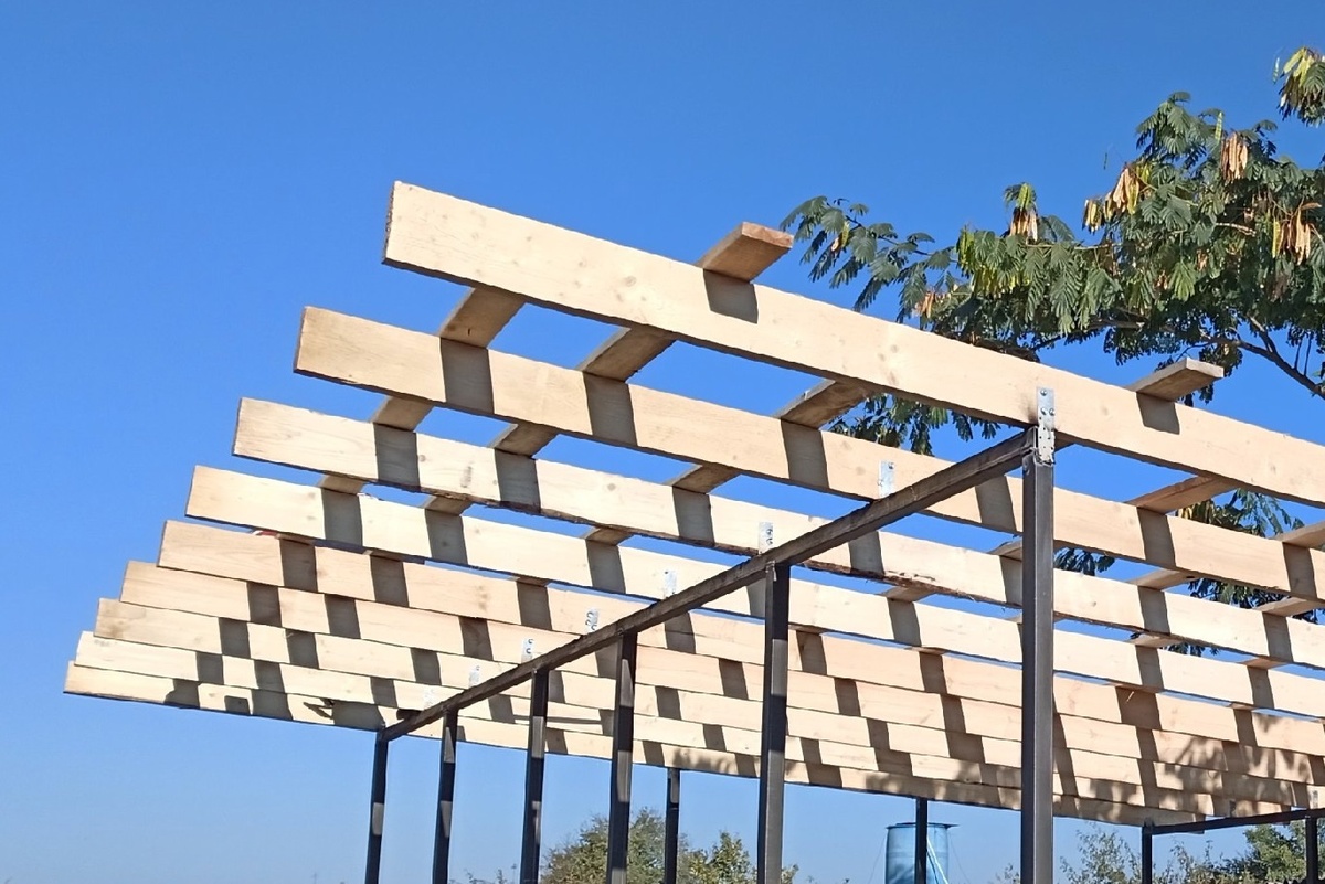 Как возвести хозяйственную постройку над обустроенным погребом. Этап 1. Сооружение крыши В качестве балок берём обрезную сосновую доску толщиной 50 миллиметров. Если это возможно, лучше проверить каждую прямо на месте покупки – так снижается риск приобретения сучковатой и некачественно распущенной продукции. Закрепляем балки на столбах при помощи крепёжных пластин, прихваченных к металлу сваркой, и кровельных саморезов. Поперёк конструкции располагаем 25-миллиметровый брус. С помощью строительного степлера закрепляем гидроизоляционную плёнку, на которую затем монтируем профнастил. По периметру устанавливаем водосточные желоба. Этап 2. Монтаж каркаса «Скелет» будущего хозблока изготавливаем всё из той же 25-миллиметровой доски. Прикручивать также можно кровельным саморезом прямо к металлу – здесь потребуется приложить усилие. Важно располагать брус на правильном расстоянии, чтобы можно было прикрепить элементы стен и сверху, и снизу. Поскольку оба материала склонны к впитыванию влаги, м
