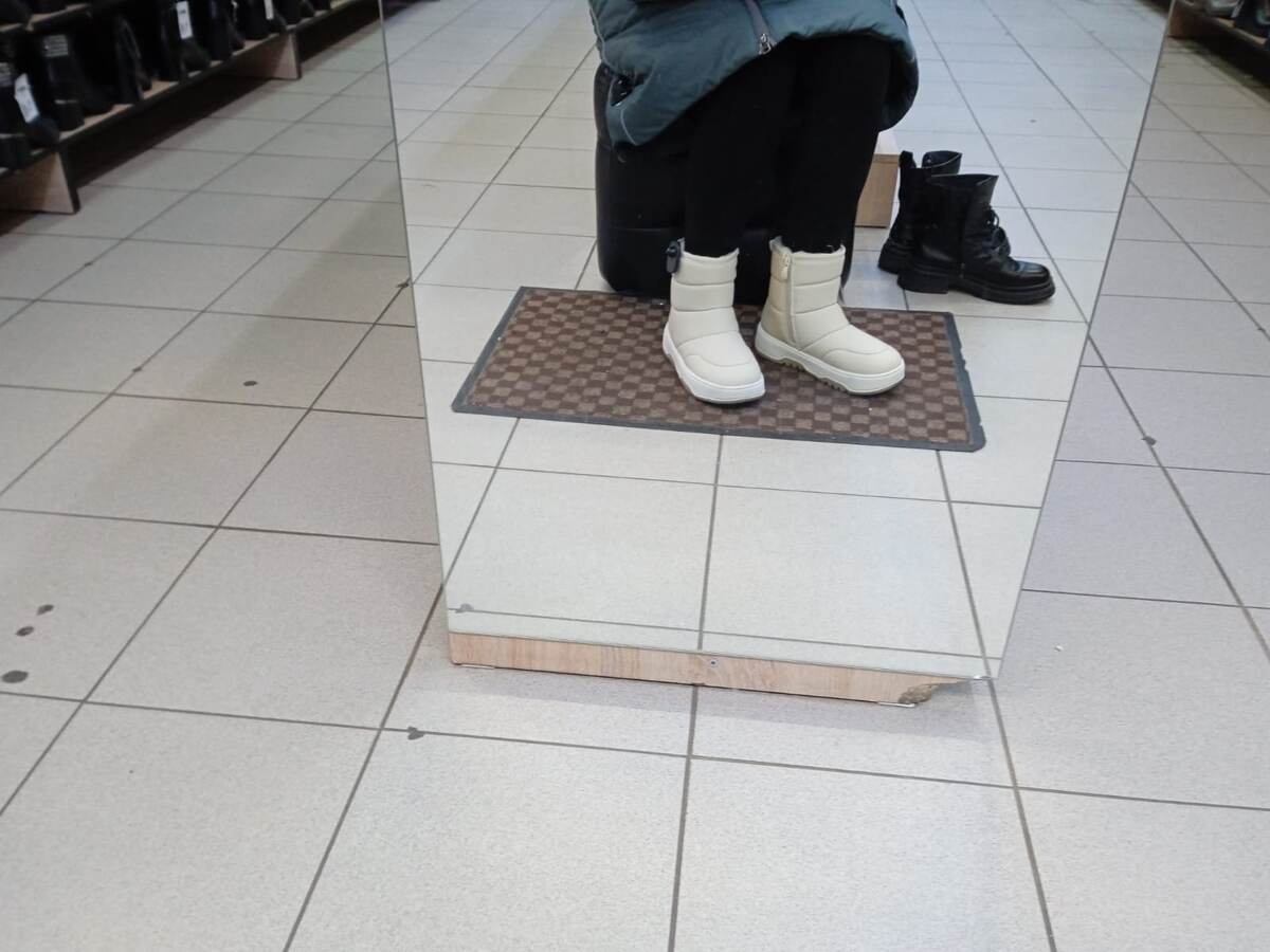 Всем привет. По советам подписчиков заказала на Вайлдберриз две пары сапог. Одни пришли в пункт выдачи, а вторые еще нет. Пока туда не пойду, а подожду когда придут вторые сапоги. В пункте примерию их и если какие-то подойдут то куплю, а если обе пары подойдут то выкуплю обе. Цена у них не очень высокая, а много обуви иметь хорошо. Дольше она будет носиться и всегда есть запас если что. Пока жду сапог пошла в экономный магазин посмотреть какие там продают сапоги и заодно примерить какие - нибудь. По размеру и по цене примерила вот такие. Их стоимость две четыреста. Мне понравилось как они на ноге сидят, в смысле удобства. Они легкие и мягкие. Не очень хотелось белые сапоги покупать. Через неделю они превратятся в черные по нашей погоде и в нашем транспорте. Больше мне ничего примерить не захотелось. Моего размера не было. Были или большие или маленькие. Обувь покупаю 38 размера с учетом косточки на одной ноге. Белые сапоги были 37 размера, но на ногу сели хорошо и были удобными. Верх