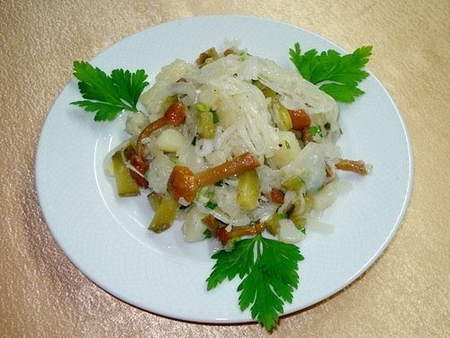 Лук репчатый очистить и нарезать полукольцами. Маринованные грибы нарезать небольшими кусочками. Маринованные огурцы нарезать кубиками. Квашеную капусту отжать от лишней жидкости.