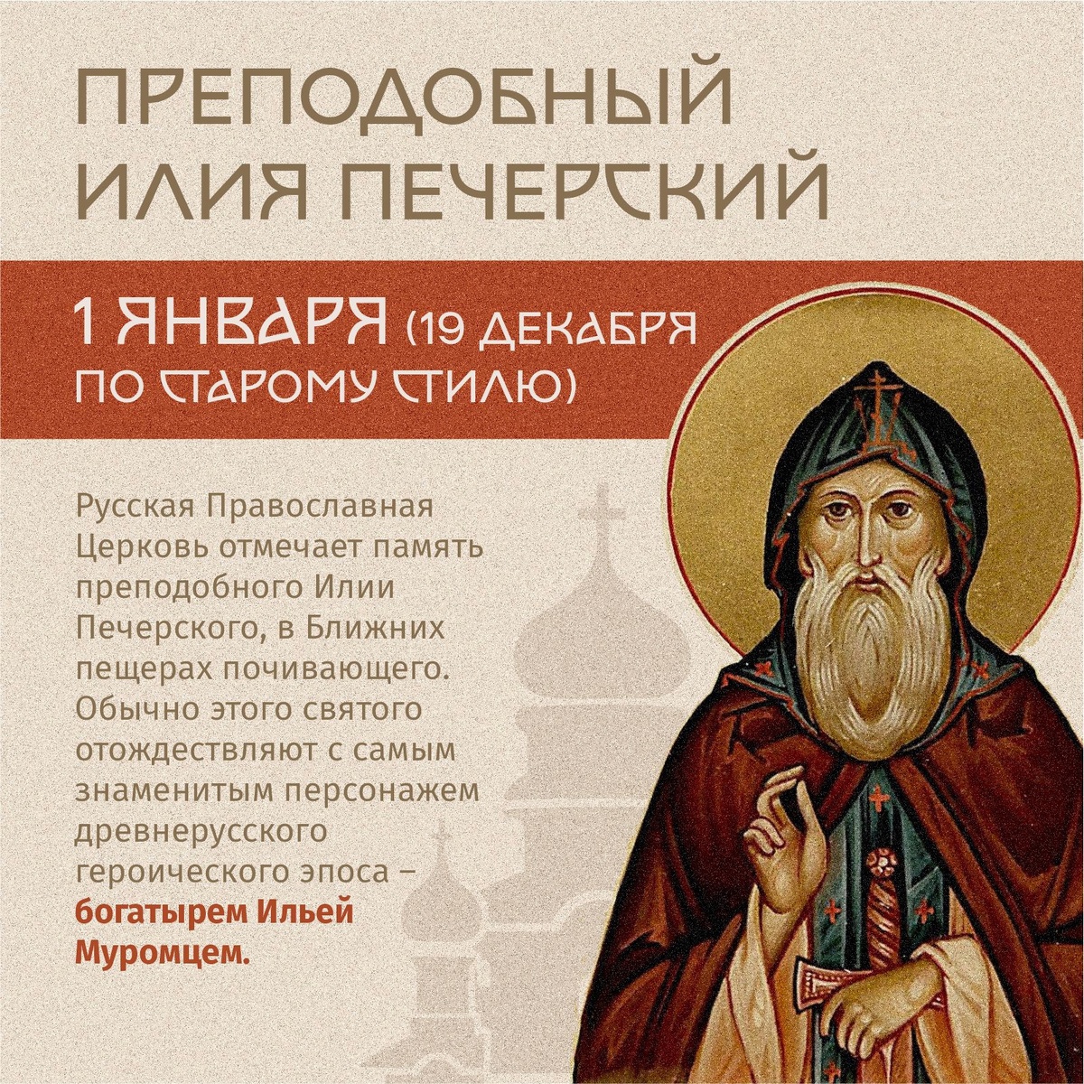 1 января (19 декабря по старому стилю) Русская православная церковь чтит память преподобного Илии Печерского, в Ближних пещерах почивающего. Обычно этого святого отождествляют с самым знаменитым персонажем древнерусского героического эпоса – богатырем Ильей Муромцем.