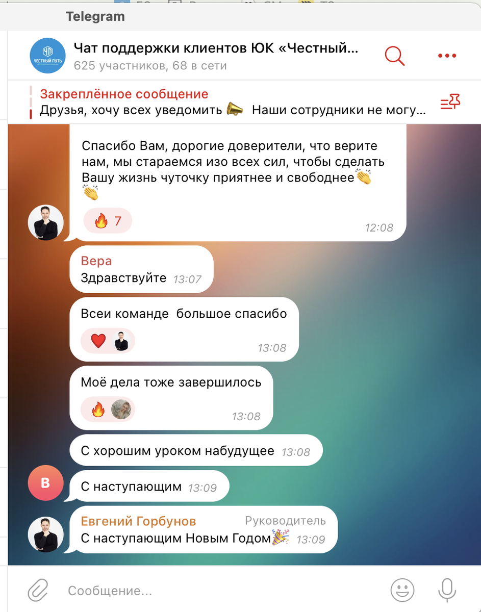 Именно поэтому мы стараемся быть максимально открытыми, показываем свои лица, создали чат поддержки доверителей. В этом чате сейчас 630 человек и каждый из них является или являлся нашим клиентом. Сделали, правда, достаточно поздно, только в прошлом году, поэтому так мало людей. В этом чате любой человек может задать вопрос о нашей компании и действующие клиенты, доверители могут ответить на вопрос или оказать поддержку в сложных жизненных ситуациях с долгами, коллекторами, банками, ведь они сами проходили или сейчас проходят через это. Мы создаем целое сообщество!